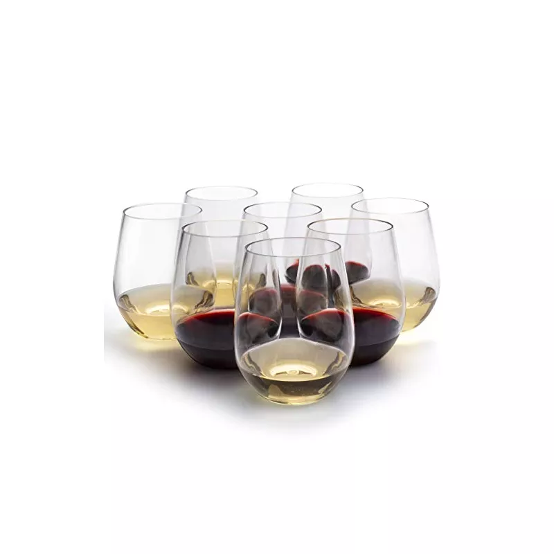 - Each glass is made from Tritan, a plastic type material that looks like glass, but won’t shatter or break like glass.